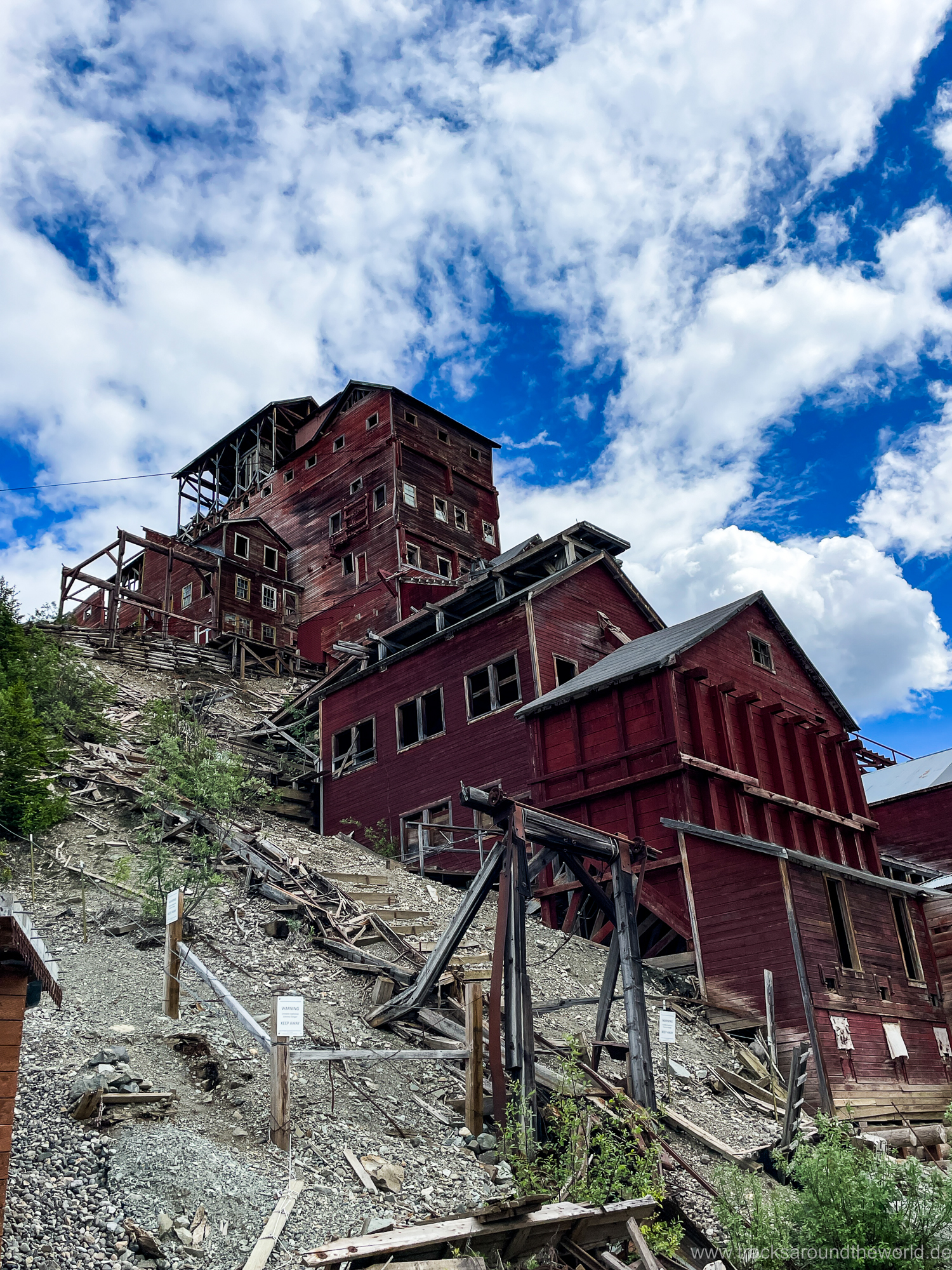 Schon die Anfahrt zu unserem ersten Ziel, dem Wrangell-St. Elias N.P. bei McCarthy ist beeindruckend: tief vergletscherte 4000er Berge bilden zusammen mit dem auf kanadischer Seite liegenden Kluane N.P. das größte zusammenhängende Eisfeld der Welt außerhalb der Pol-Regionen. Die letzten 150 km sind eine nette Schotterpiste, womit auch Shujaa mal wieder auf seine Kosten kommt. Bei der Wanderung zur aufgegebenen Kennicot Kupfermiene und dem nahegelegenen Gletscher ist uns das Wetter noch gnädig, aber schon am Abend kommt die Schlechtwetterfront, so dass es leider nichts mit unserem geplanten Flug über die Gletscher wird.