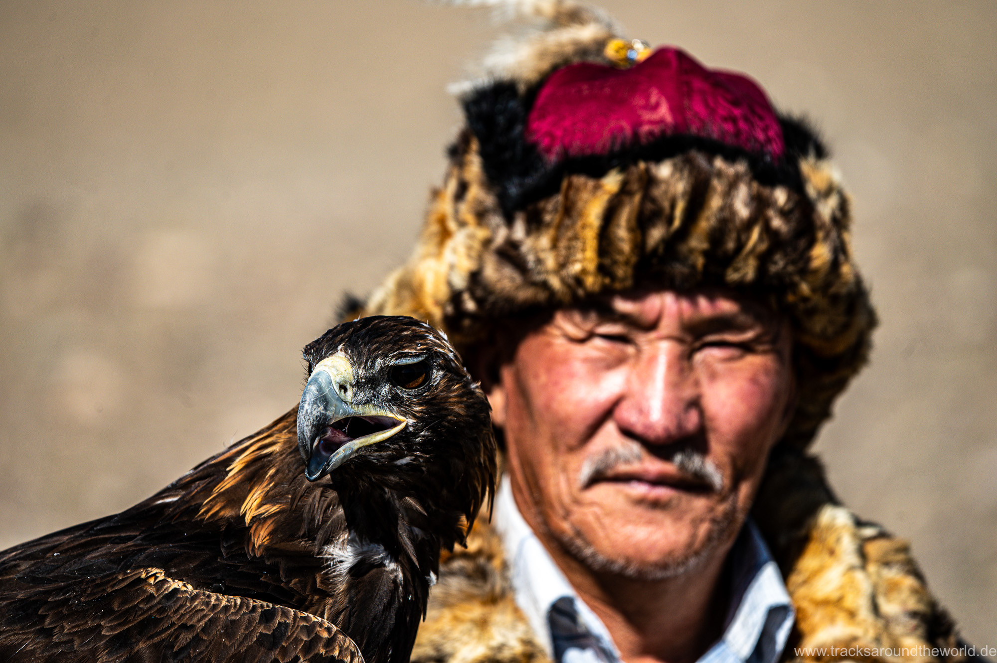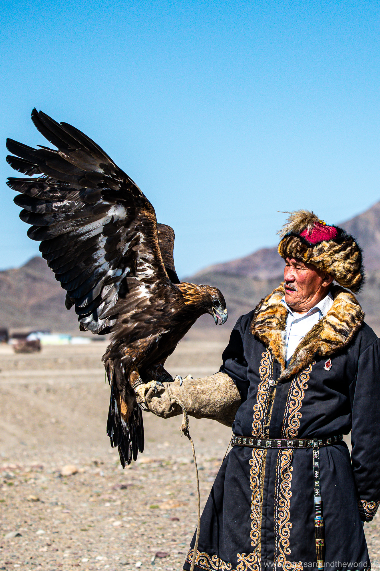 Im Westen der Mongolei, im Altai Gebirge, werden – im Gegensatz zu den meisten anderen Regionen weltweit – keine Falken zur Tierjagd abgerichtet, sondern Steinadler: die Jungküken werden aus dem Nest genommen und an den Adlermann gewöhnt und mittels Nahrungs-Entzugs bzw. Zuteilung auf die Jagd abgerichtet. Da die Adler recht alt werden, werden diese wieder nach einigen Jahren in die Freiheit entlassen, damit sie noch etwas vom „Leben haben“. Insgesamt gehen die Mongolen mit der Natur und den Tieren sehr respektvoll um, bei der Schlachtung wird kein Tropfen Blut verschwendet, bis hin, dass sie keine Ahnen bestatten oder Schuhe mit nach obenstehenden Spitzen tragen, um die Erde nicht zu verletzen. In der Mongolei werden Murmeltiere, Marder, Füchse etc. mit Adlern gejagt. Jagdsaison ist der Winter und im Sommer kämpfen die, dann vollgefutterten, Adler mit Hitze-Problemen, wie wir bei „unserer“ Adlerdame selbst sehen konnten, die nach ausgiebigem Foto-Shooting doch ziemliche thermische Probleme hat. Eine kleine Sprenkeldusche bringt Abkühlung, was sie sichtlich genießt. Der Besuch dieses Cultural Centers ist ein toller Auftakt unserer Mongolei Reise.