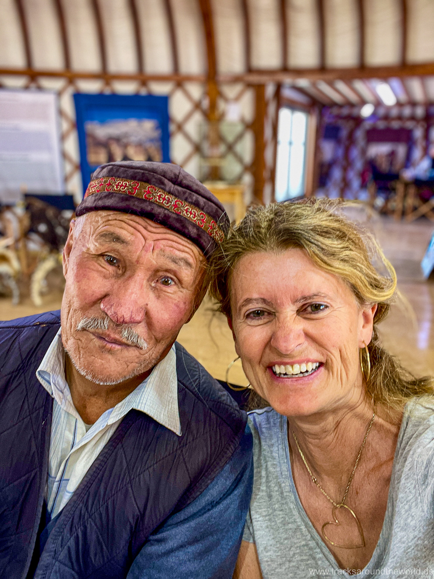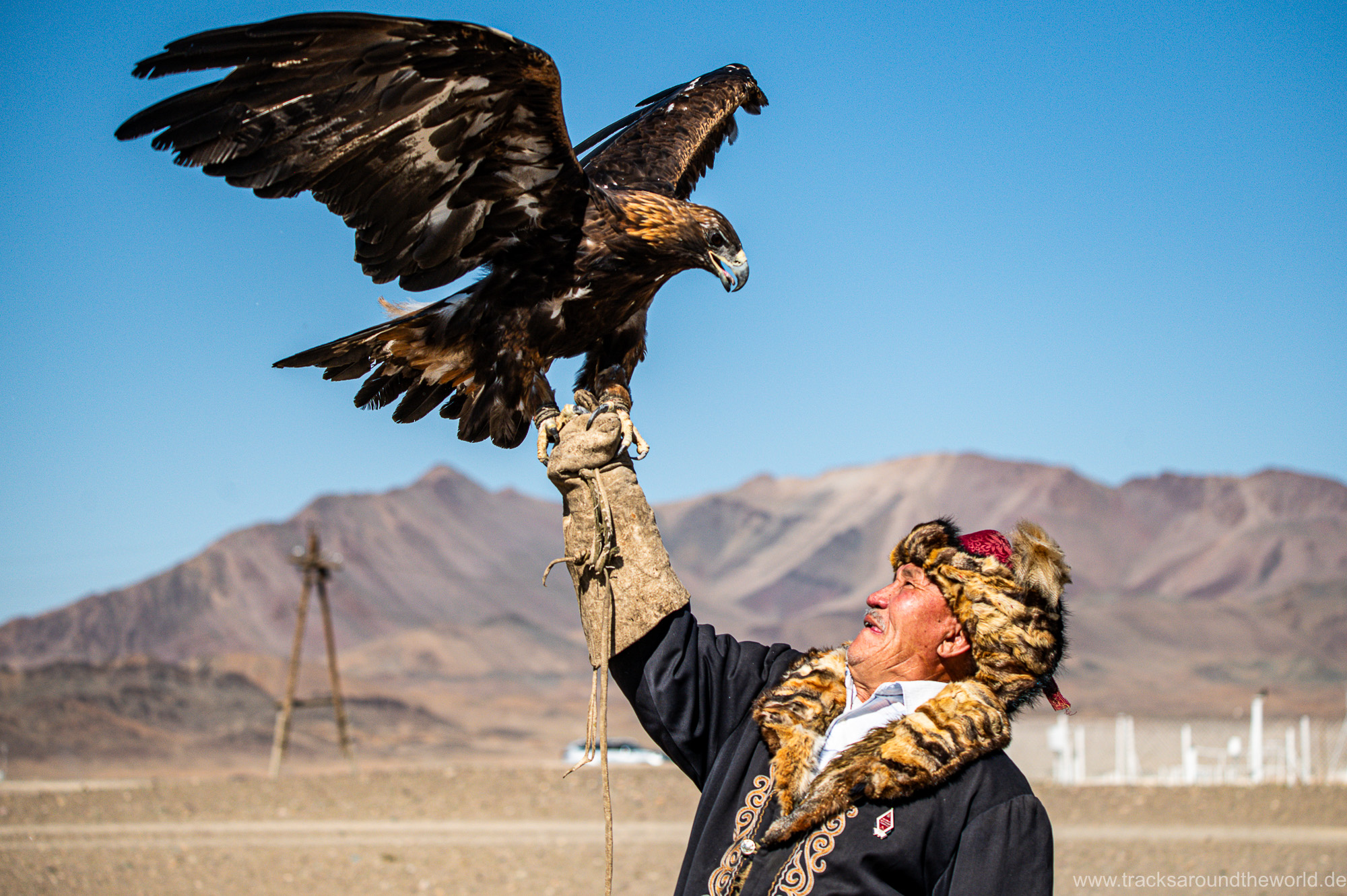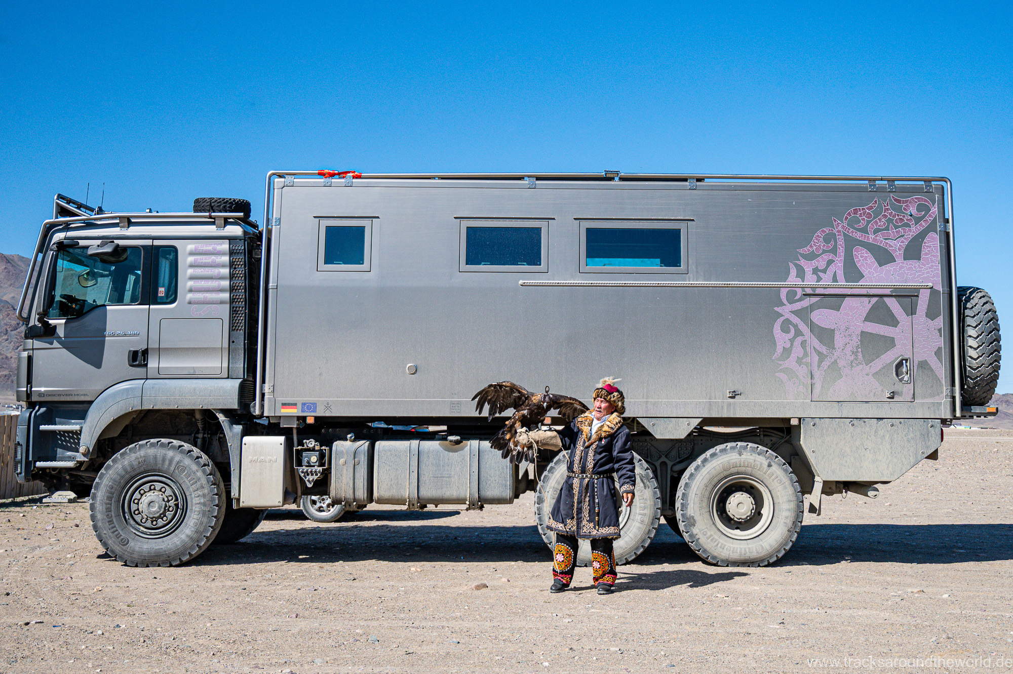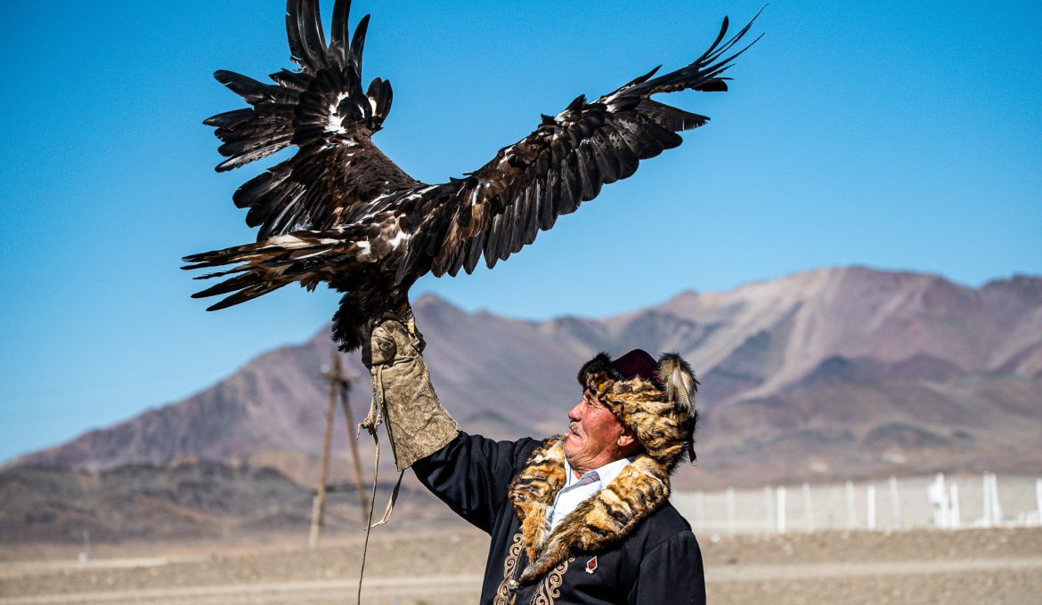 Die erste größere Stadt ist Ölgi. Wir sind überrascht wie vergleichsweise zivilisiert es hier ist: Supermärkte, vernünftige Tankstellen (bei denen man endlich wieder mit Kreditkarte zahlen kann, was in Russland ja wegen der Abkopplung vom internationalen Zahlungssystem nicht möglich war) und sogar ein paar Hochhäuser gibt es. Wir machen nochmals einen Einkauf, gönnen Shujaa die dringend notwendige Wagenwäsche, lassen unseren Astabweiser wieder anschweißen und besuchen das erst kürzlich eröffnete Golden-Eagle-Cultural-Center. Der herbeitelefonierte „Berkutschi“ (Adlermann) kommt in voller Tracht mit seinem Jagd-Stein-Adler in seinem Toyota Hybrid Prius zu uns angebraust.