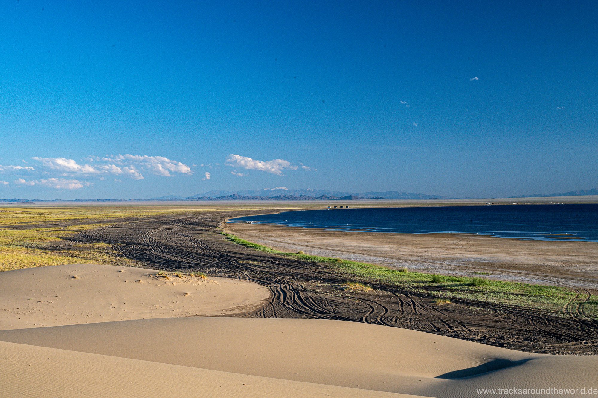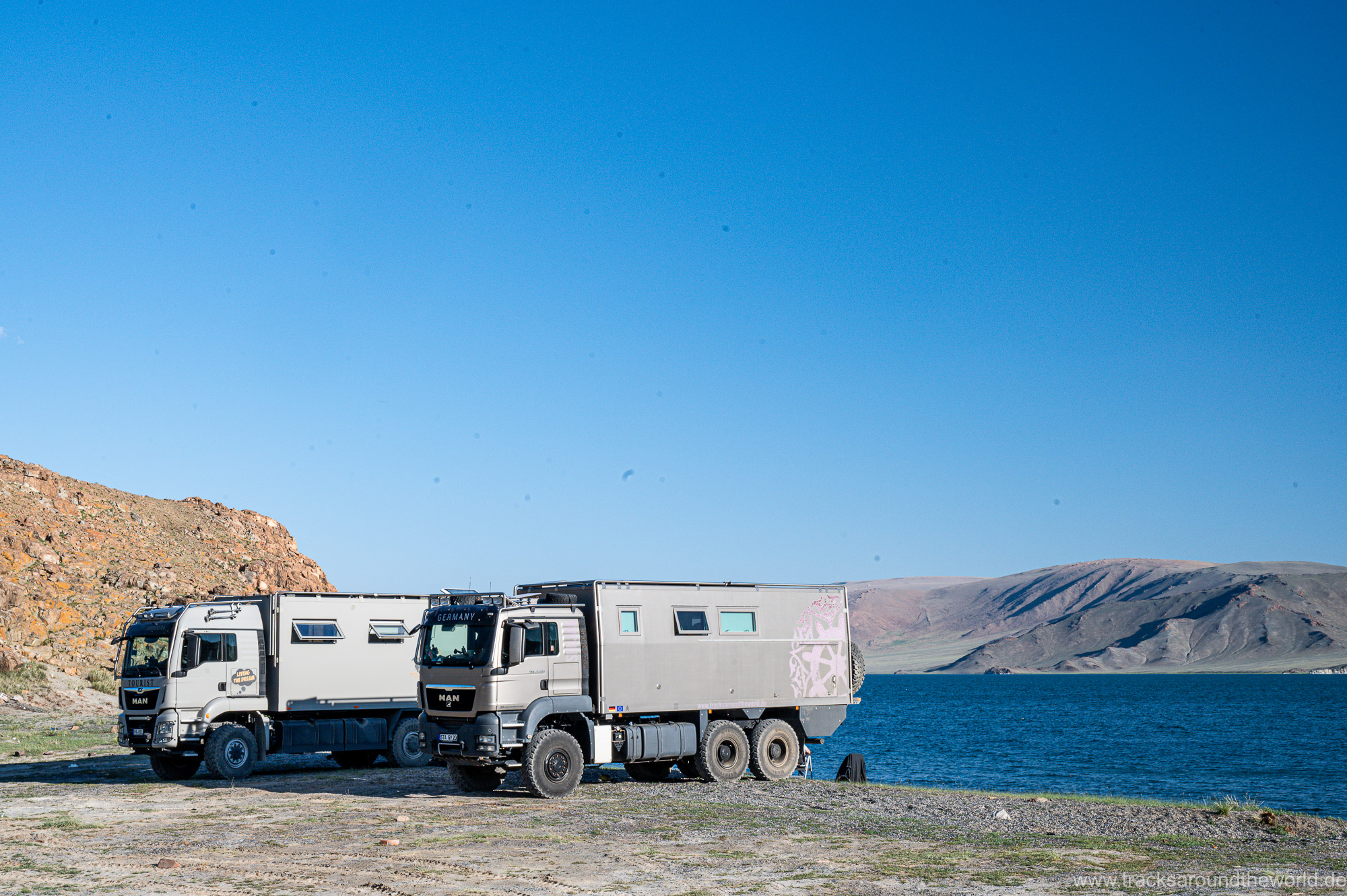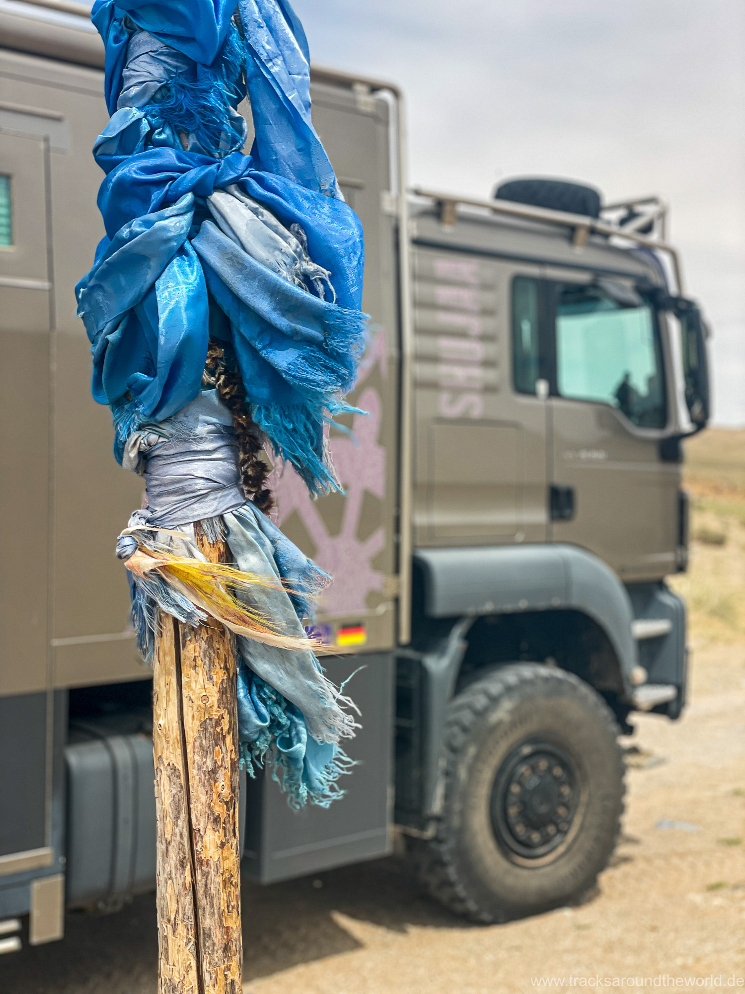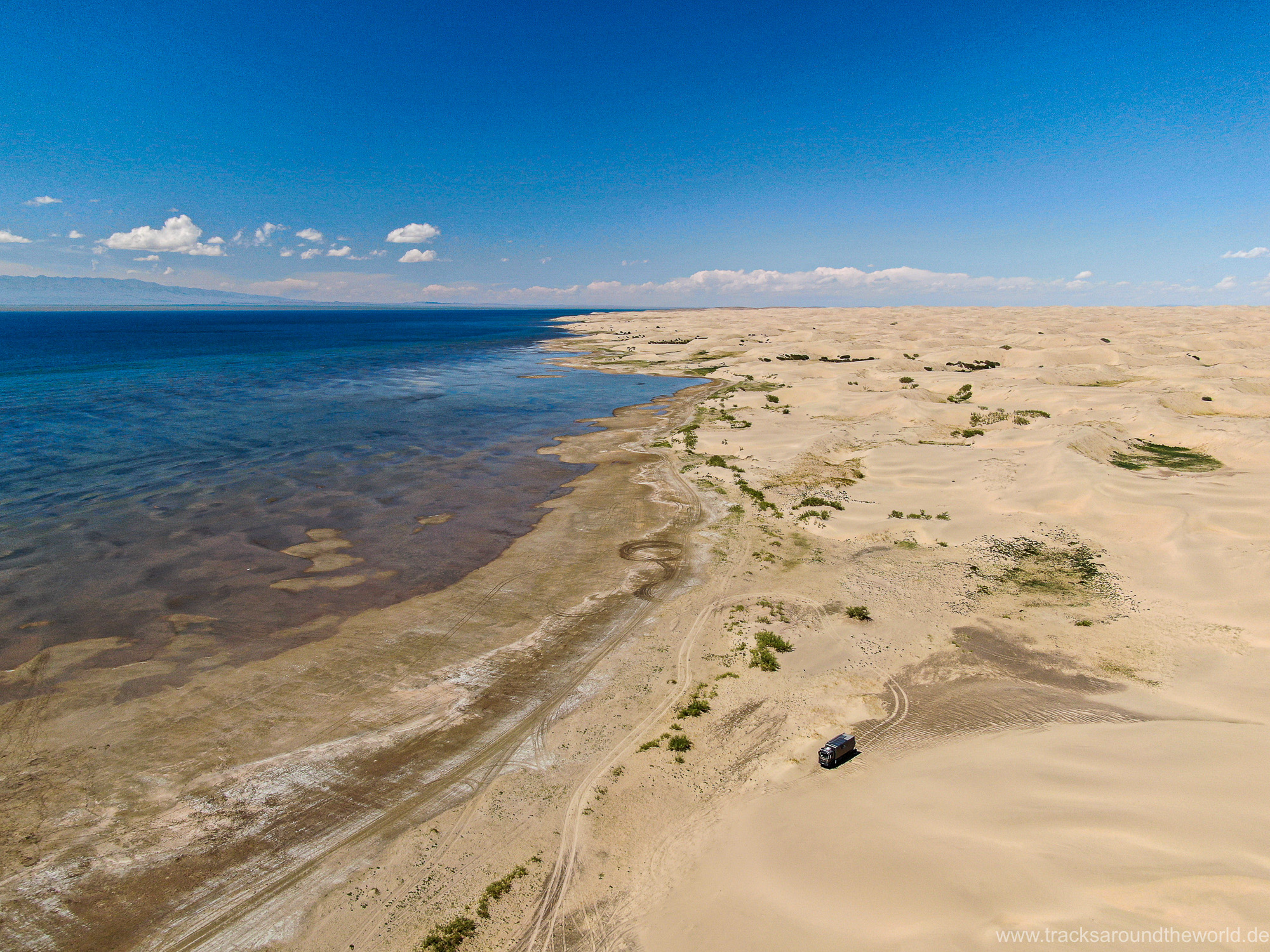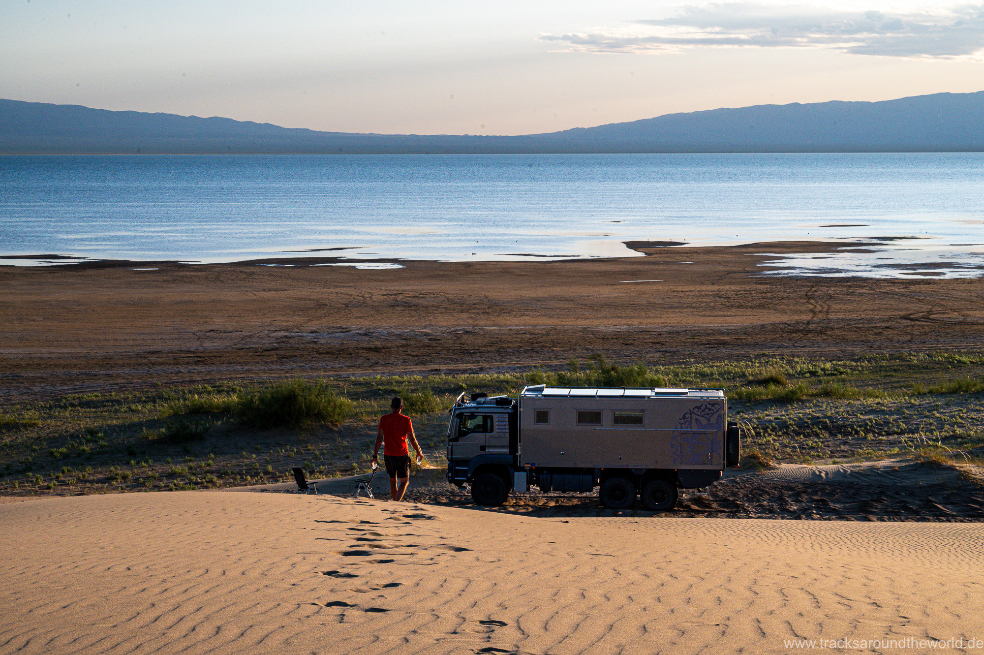 Dann bunkern wir noch 800 Liter Frischwasser in einem „Wasserhaus“: da in der Mongolei kaum ein Haushalt an die Frischwasser-Versorgung angeschlossen ist, gibt es in jedem größeren Ort Wasserhäuser, wo die Anwohner mit einer Wasserkarte ihren Bedarf in Kanister abfüllen können. Trinkwasserqualität und eiskalt! Danach geht es zum See Tolbu Nuur, wo wir – wie schon in Ölgi – erneut deutsche bzw. österreichische Overlander treffen. Wo auf dem Pamir und in den STAN-Staaten mittlerweile viele europäische Overlander unterwegs sind, werden in Richtung Mongolei die ausländischen Fahrzeuge eine Seltenheit. Wir vermuten, dass es hier für viele zu einsam ist, zu wenig Infrastruktur bietet und zu weit ist.