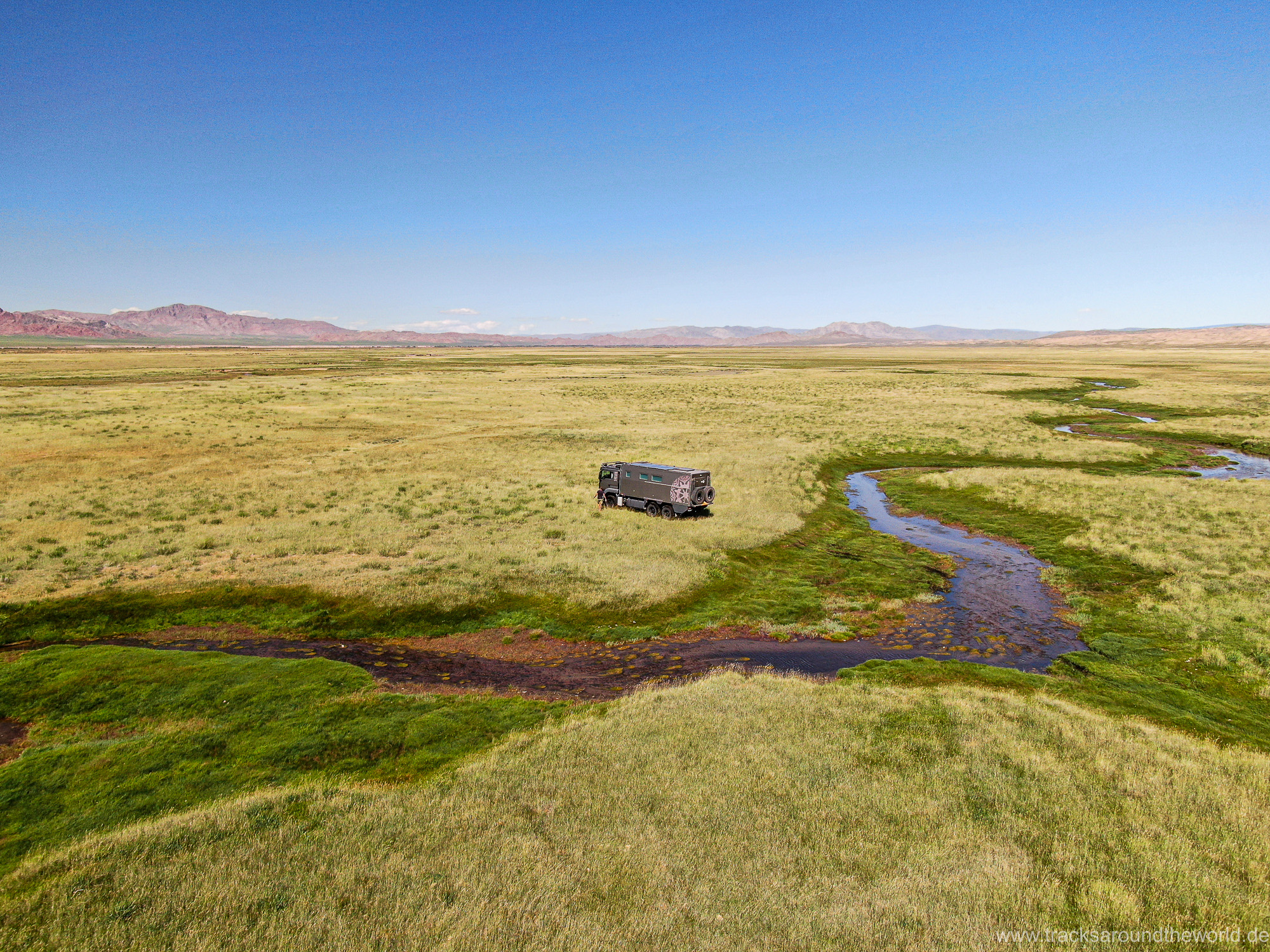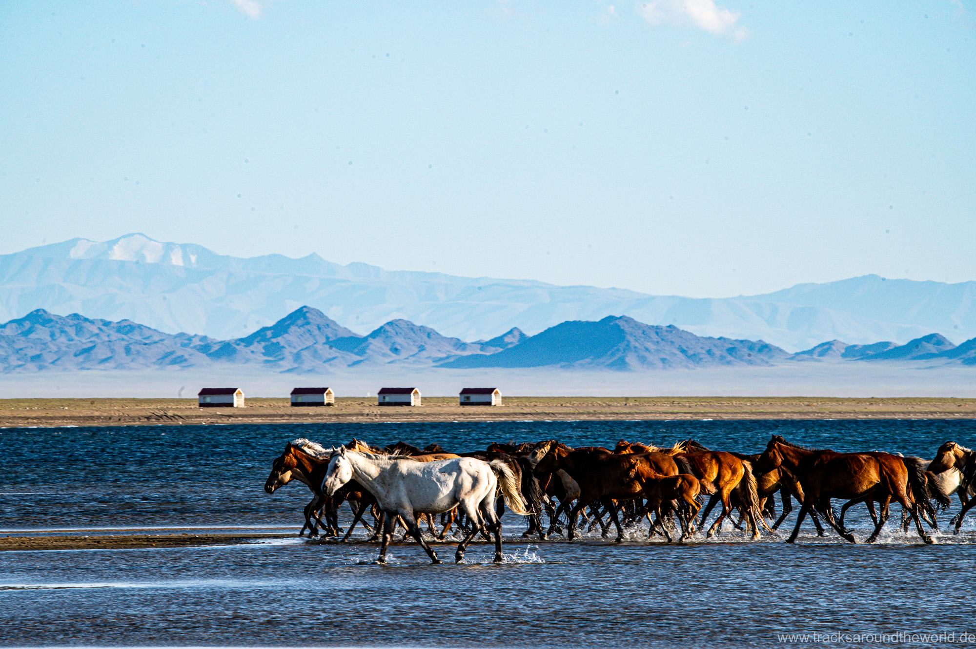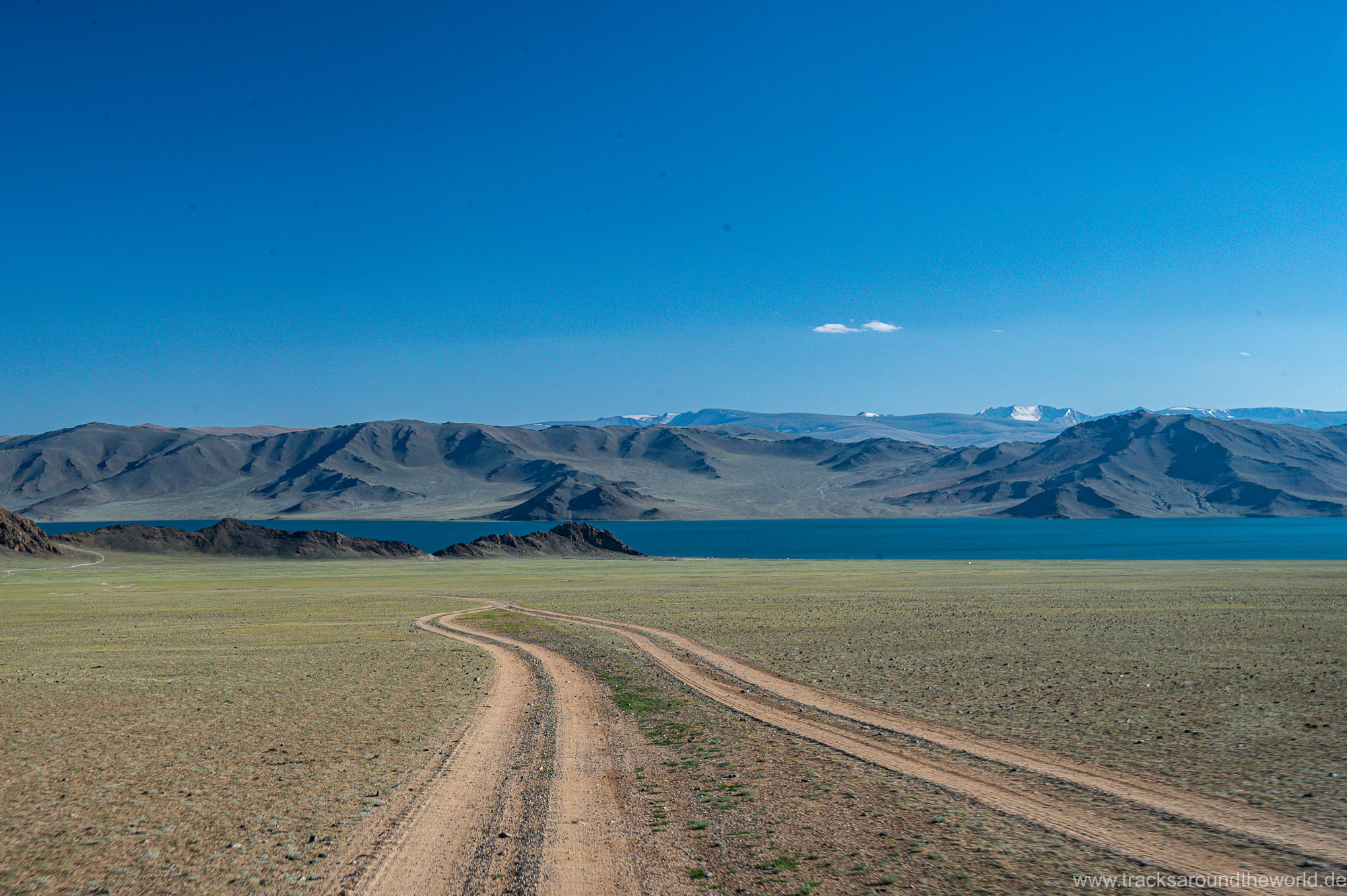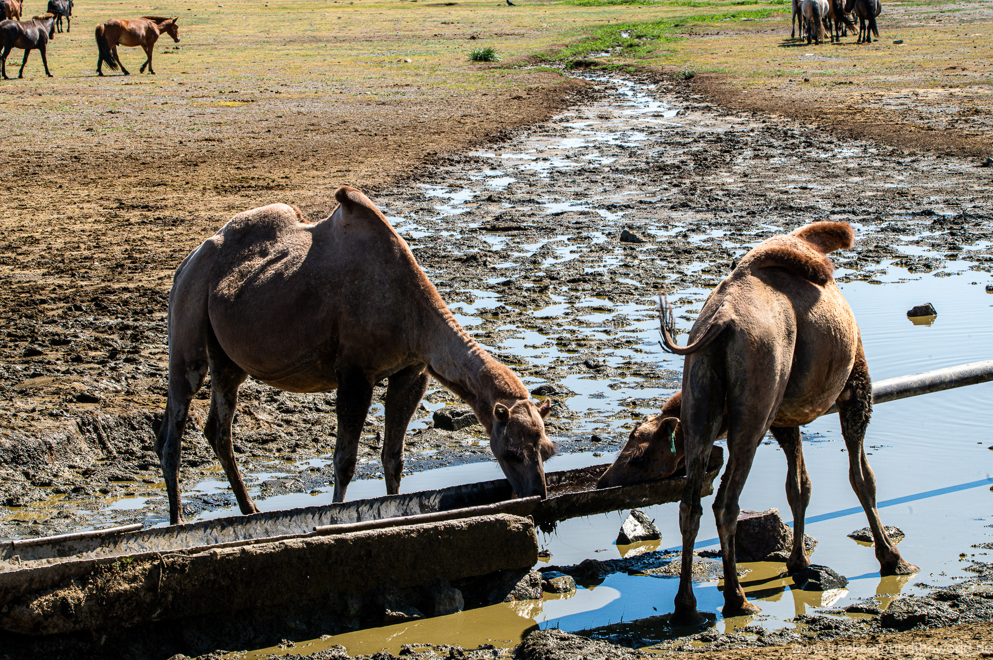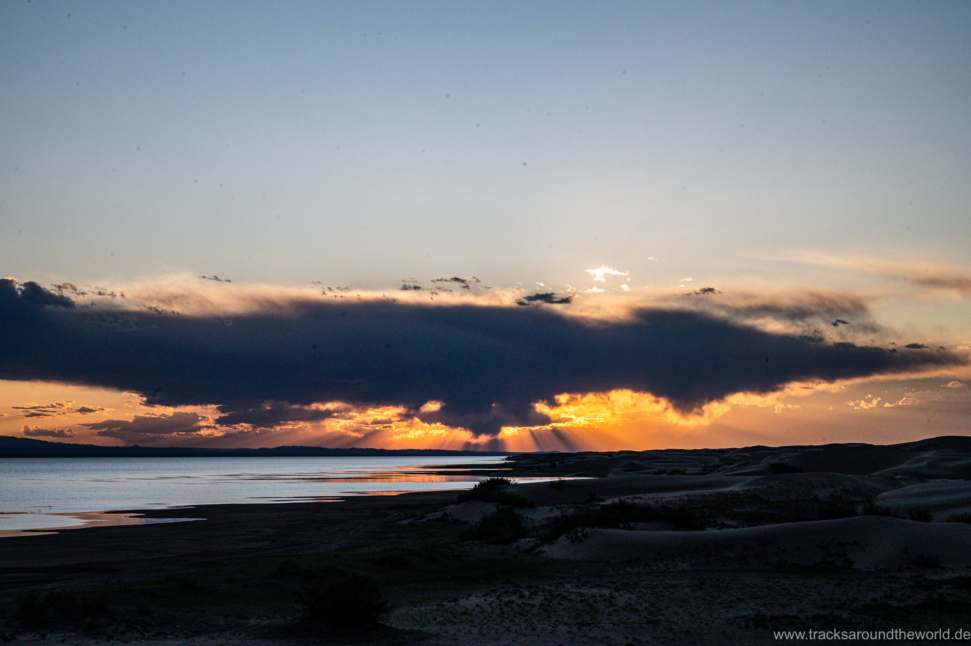 Dann bunkern wir noch 800 Liter Frischwasser in einem „Wasserhaus“: da in der Mongolei kaum ein Haushalt an die Frischwasser-Versorgung angeschlossen ist, gibt es in jedem größeren Ort Wasserhäuser, wo die Anwohner mit einer Wasserkarte ihren Bedarf in Kanister abfüllen können. Trinkwasserqualität und eiskalt! Danach geht es zum See Tolbu Nuur, wo wir – wie schon in Ölgi – erneut deutsche bzw. österreichische Overlander treffen. Wo auf dem Pamir und in den STAN-Staaten mittlerweile viele europäische Overlander unterwegs sind, werden in Richtung Mongolei die ausländischen Fahrzeuge eine Seltenheit. Wir vermuten, dass es hier für viele zu einsam ist, zu wenig Infrastruktur bietet und zu weit ist.