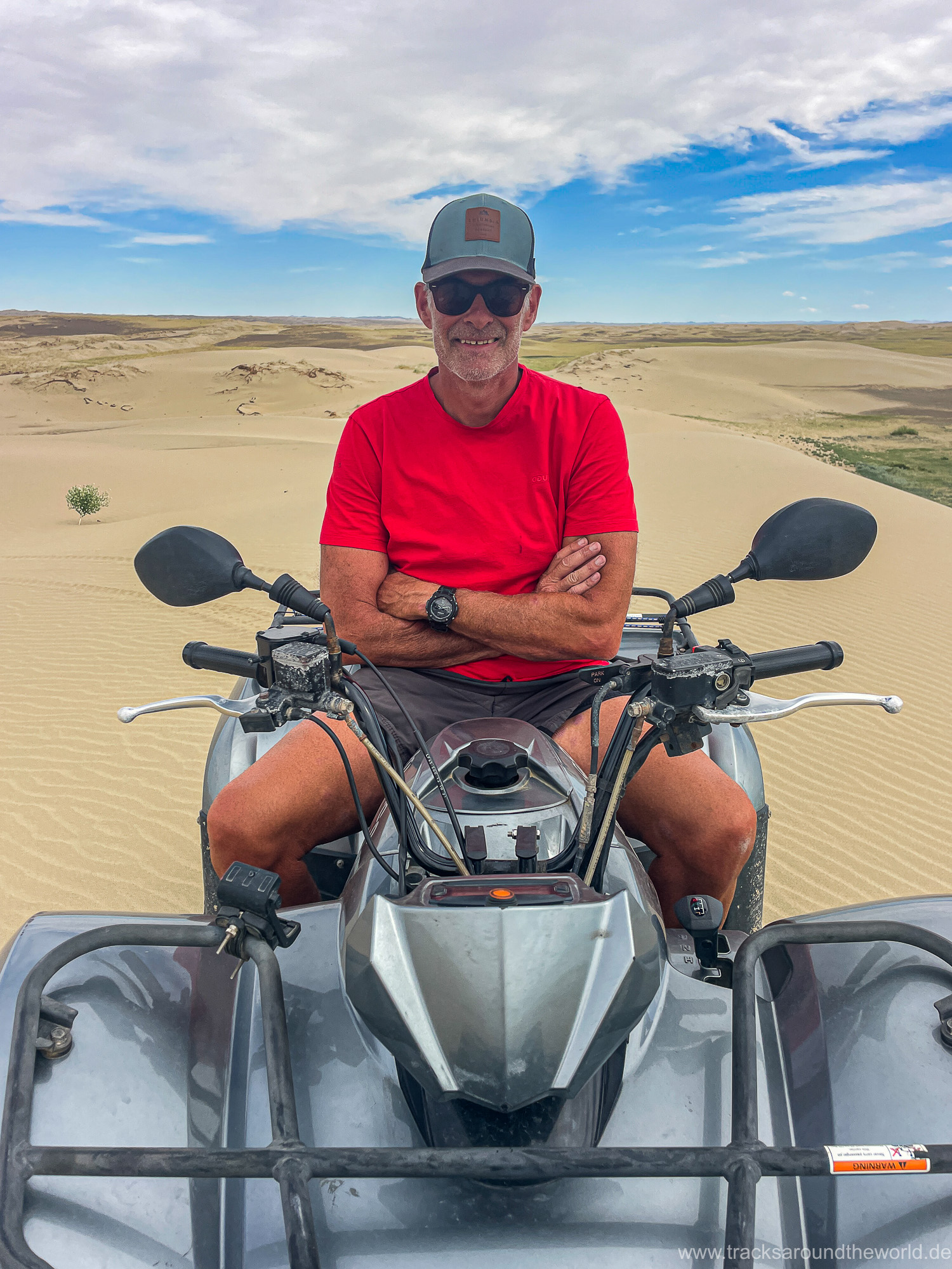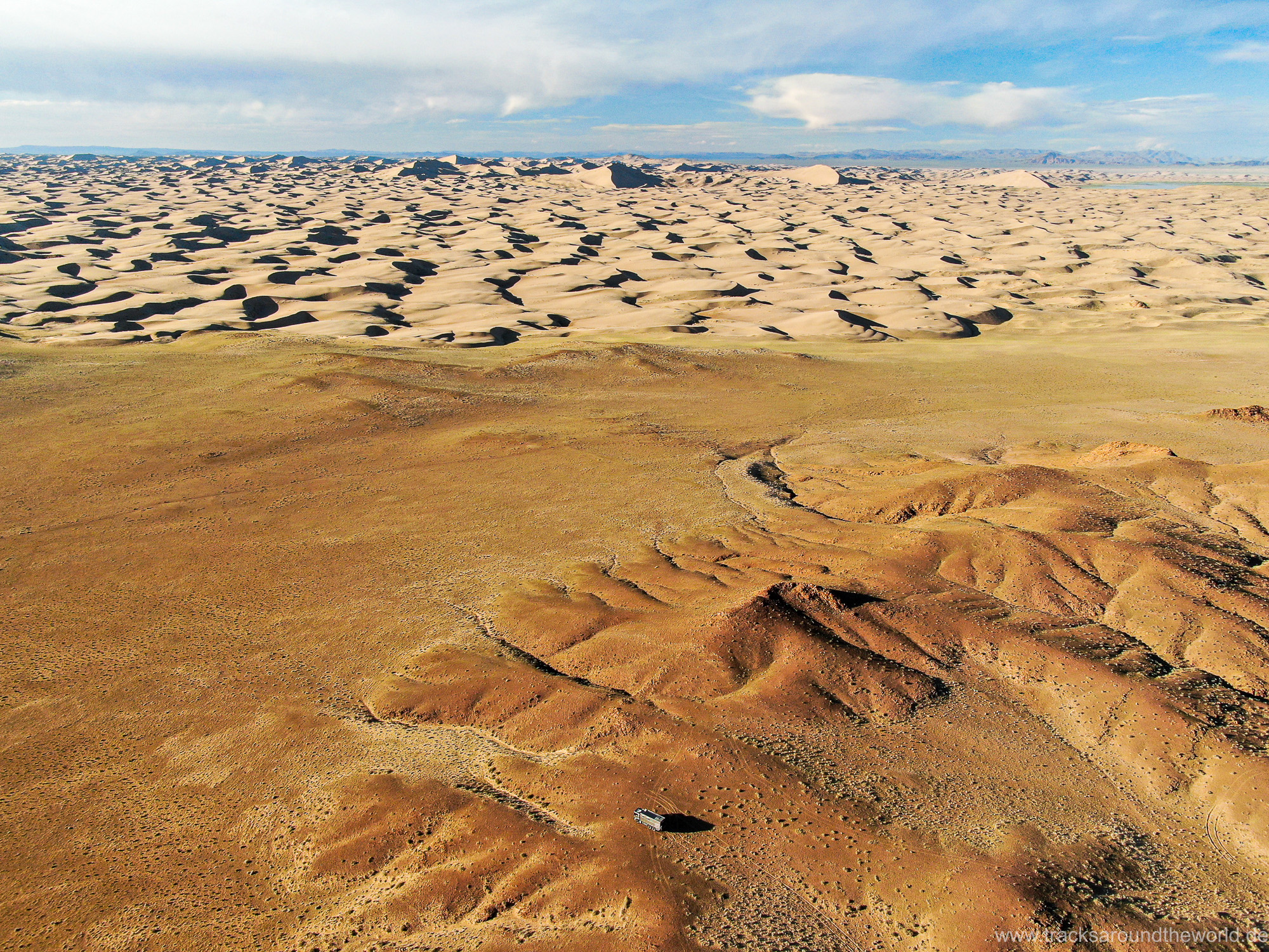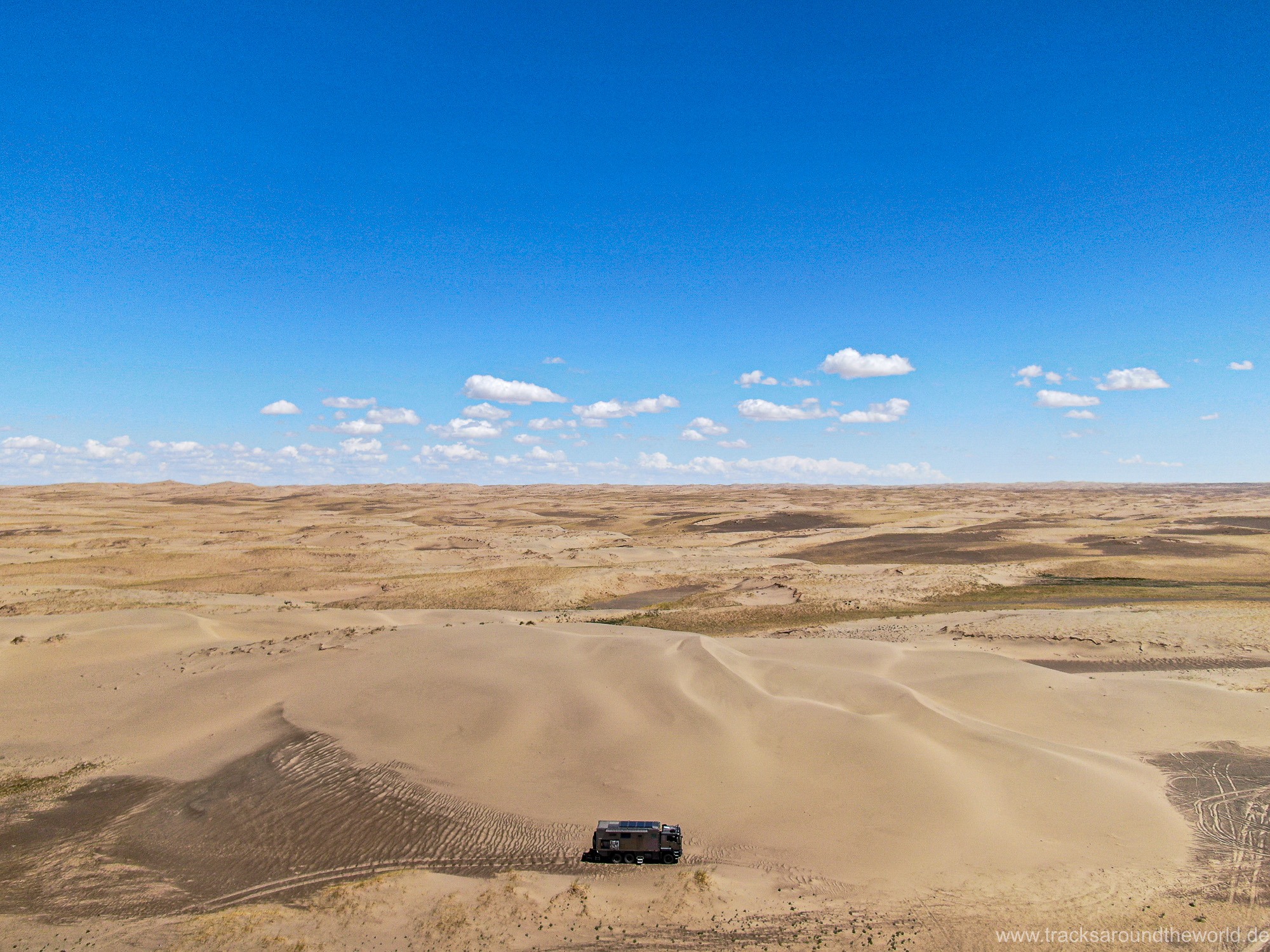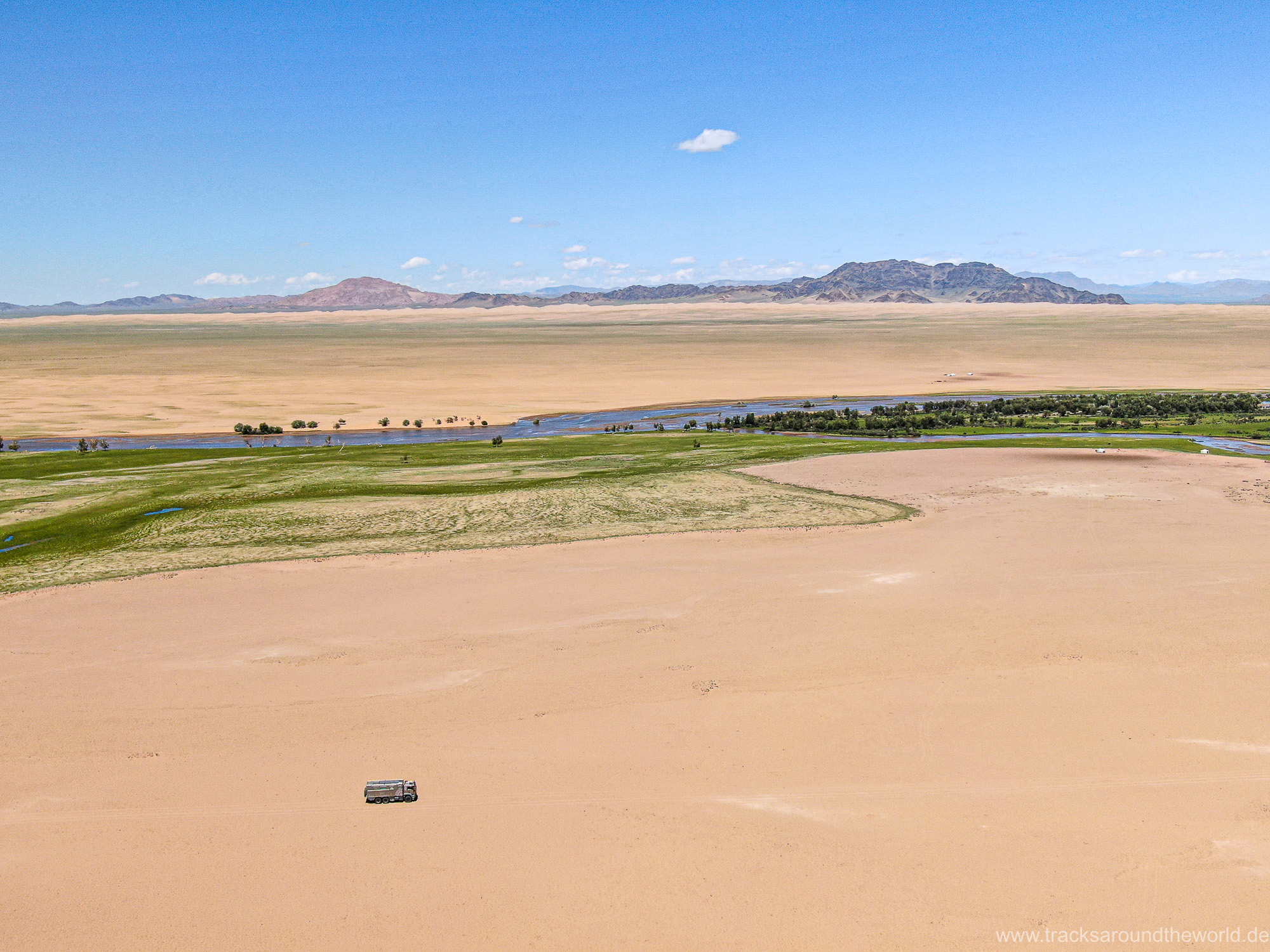 Im Nord-Westen der Mongolei gibt es viele Seen und ein weiteres Highlight ist der Dörgön Nuur mit seinen bis an das Wasser reichenden Sanddünen… da kommt auch Quad Shujoo wieder zum artgerechten Einsatz und der Gin Tonic Sundowner erinnert uns an die Wüsten der arabischen Halbinsel. Entlang des Mongol Els Sanddünen-Gebietes fahren wir weiter gen Osten und kommen in tolle Regionen, wo grün bewachsene Fluss-Ebenen fast nahtlos in goldene Sanddünen übergehen. Selten hatten wir Fahrtage, welche in Kombination der Faktoren Länge, Fahrtechnik und Navigation/beste Fahrspur auskundschaften so anspruchsvoll waren: Zahlreiche Furten (die tiefste welche bis an die Oberkante unserer nicht gerade kleinen Reifen ging, haben wir natürlich nicht festgehalten 😉), die permanente Orientierungs-Notwendigkeit (teilweise mit Hilfe unserer Drohne, Satelliten-Karten auf unseren Navis und vielen „Zu-Fuß Passagen“) für die beste Fahrstrecke sowie teilweise auch matschige Pisten lassen uns am Abend müde ins Bett fallen. Auch unseren ersten Platten auf dieser Tour haben wir zu verzeichnen. An einem Stein an der Flanke aufgerissen ist dieser leider nicht mehr reparabel.