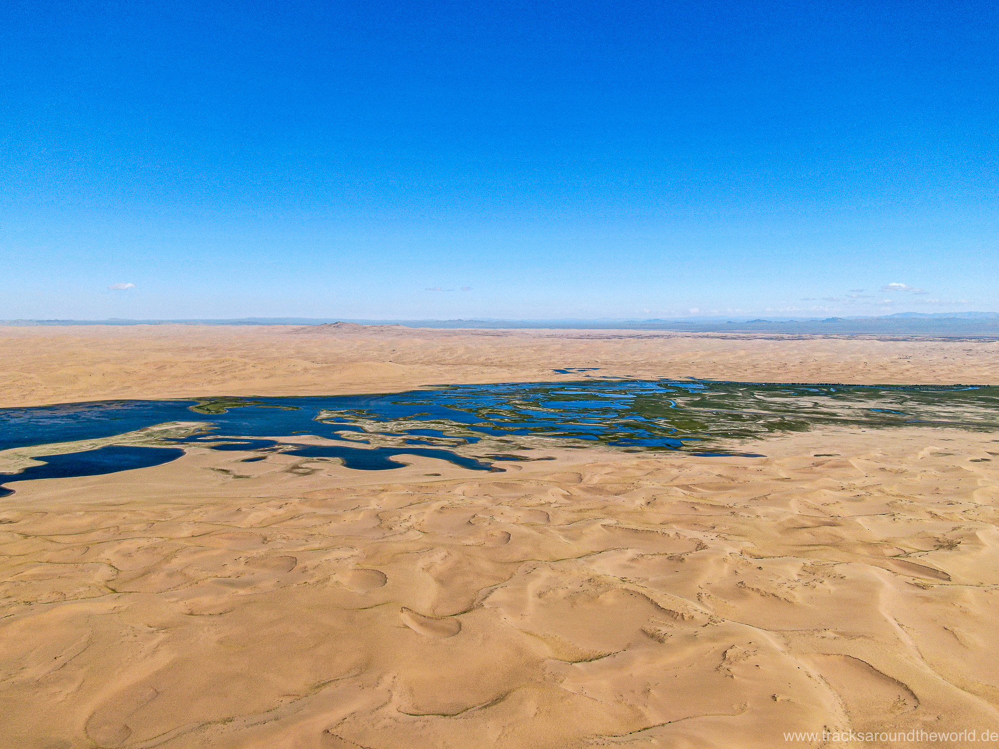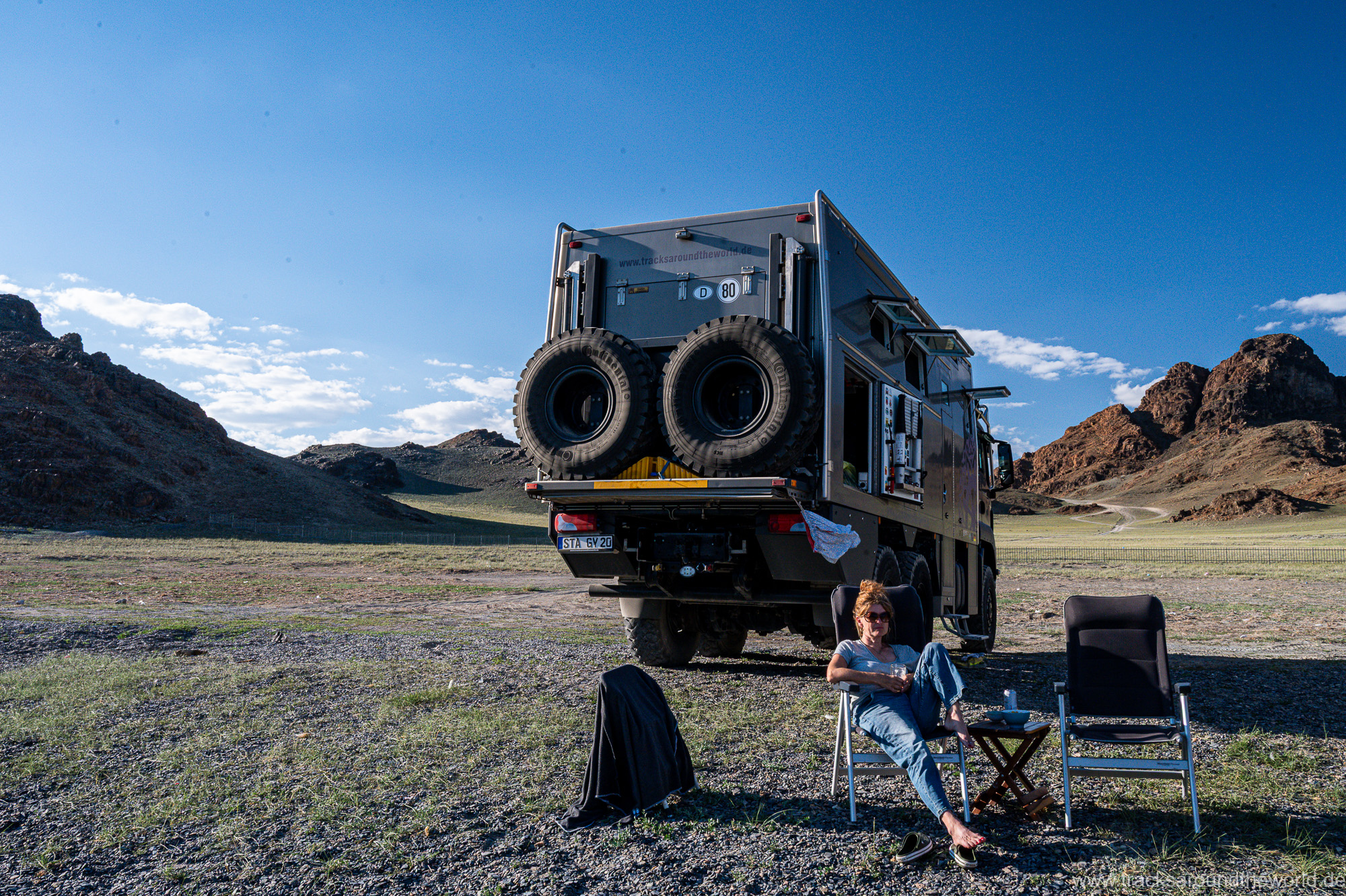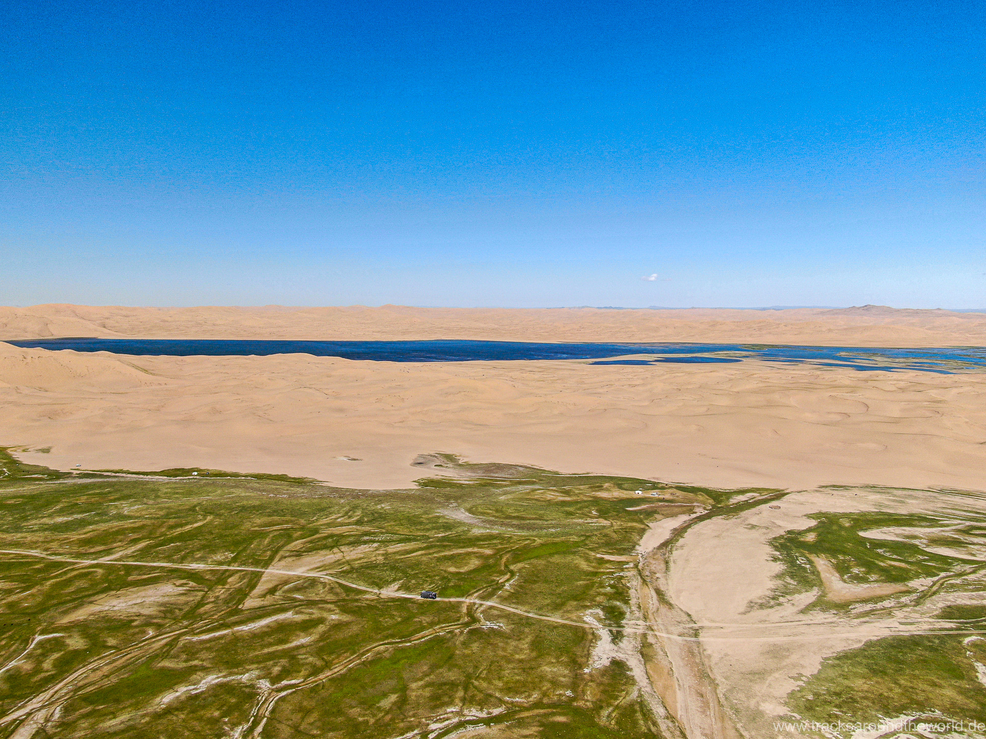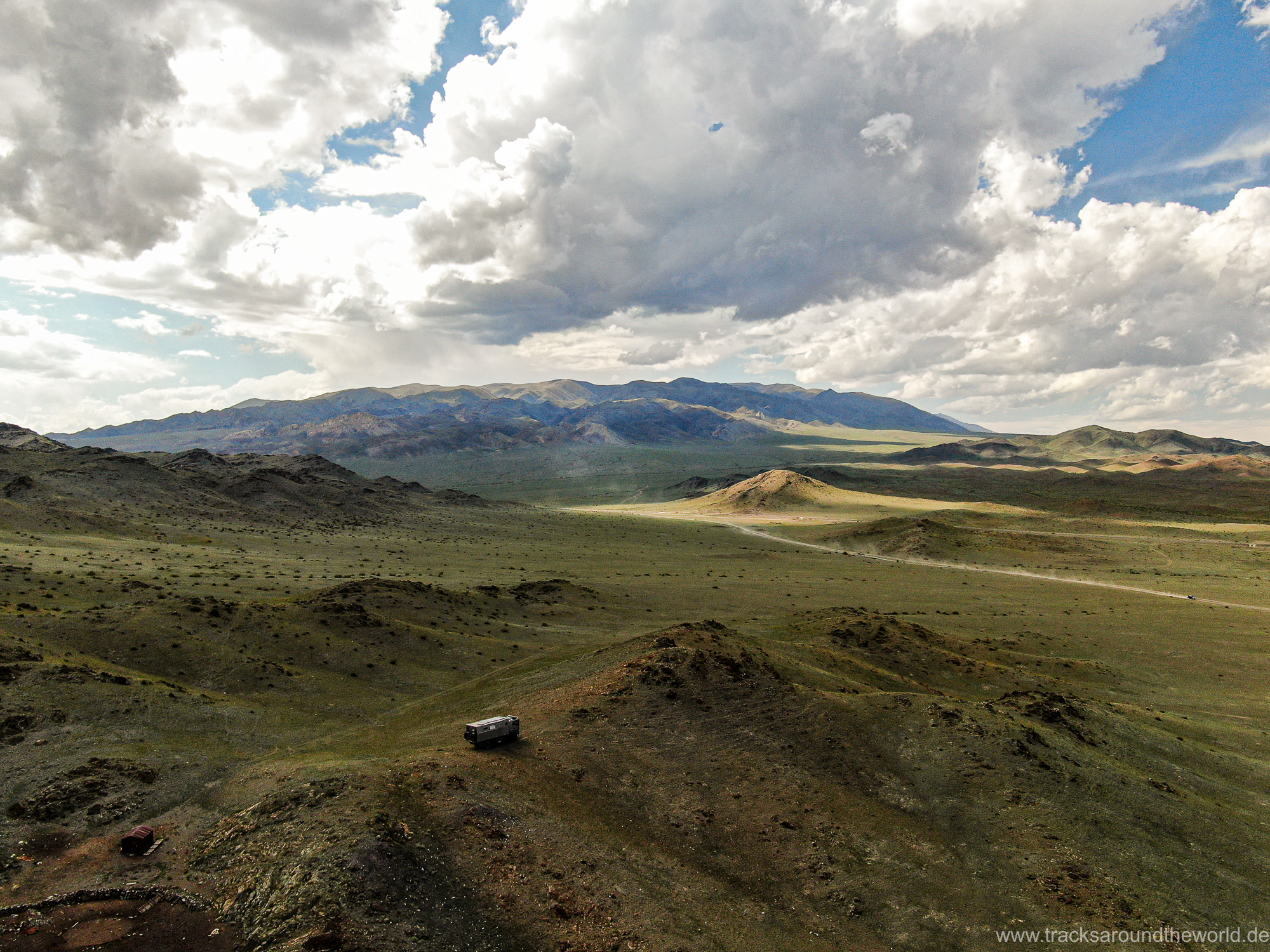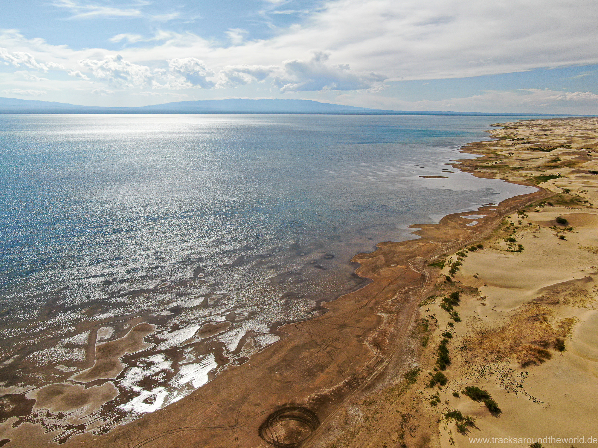 Im Nord-Westen der Mongolei gibt es viele Seen und ein weiteres Highlight ist der Dörgön Nuur mit seinen bis an das Wasser reichenden Sanddünen… da kommt auch Quad Shujoo wieder zum artgerechten Einsatz und der Gin Tonic Sundowner erinnert uns an die Wüsten der arabischen Halbinsel. Entlang des Mongol Els Sanddünen-Gebietes fahren wir weiter gen Osten und kommen in tolle Regionen, wo grün bewachsene Fluss-Ebenen fast nahtlos in goldene Sanddünen übergehen. Selten hatten wir Fahrtage, welche in Kombination der Faktoren Länge, Fahrtechnik und Navigation/beste Fahrspur auskundschaften so anspruchsvoll waren: Zahlreiche Furten (die tiefste welche bis an die Oberkante unserer nicht gerade kleinen Reifen ging, haben wir natürlich nicht festgehalten 😉), die permanente Orientierungs-Notwendigkeit (teilweise mit Hilfe unserer Drohne, Satelliten-Karten auf unseren Navis und vielen „Zu-Fuß Passagen“) für die beste Fahrstrecke sowie teilweise auch matschige Pisten lassen uns am Abend müde ins Bett fallen. Auch unseren ersten Platten auf dieser Tour haben wir zu verzeichnen. An einem Stein an der Flanke aufgerissen ist dieser leider nicht mehr reparabel.