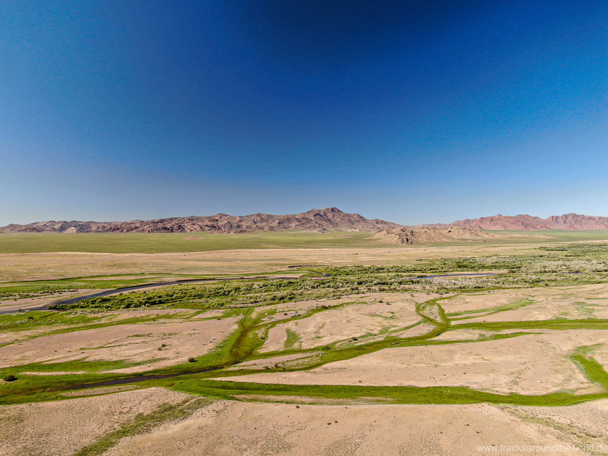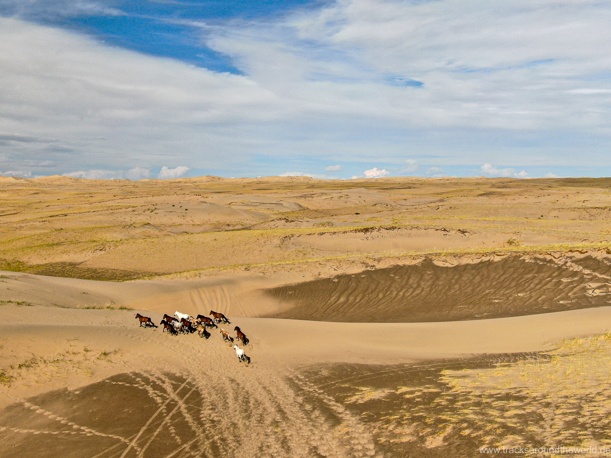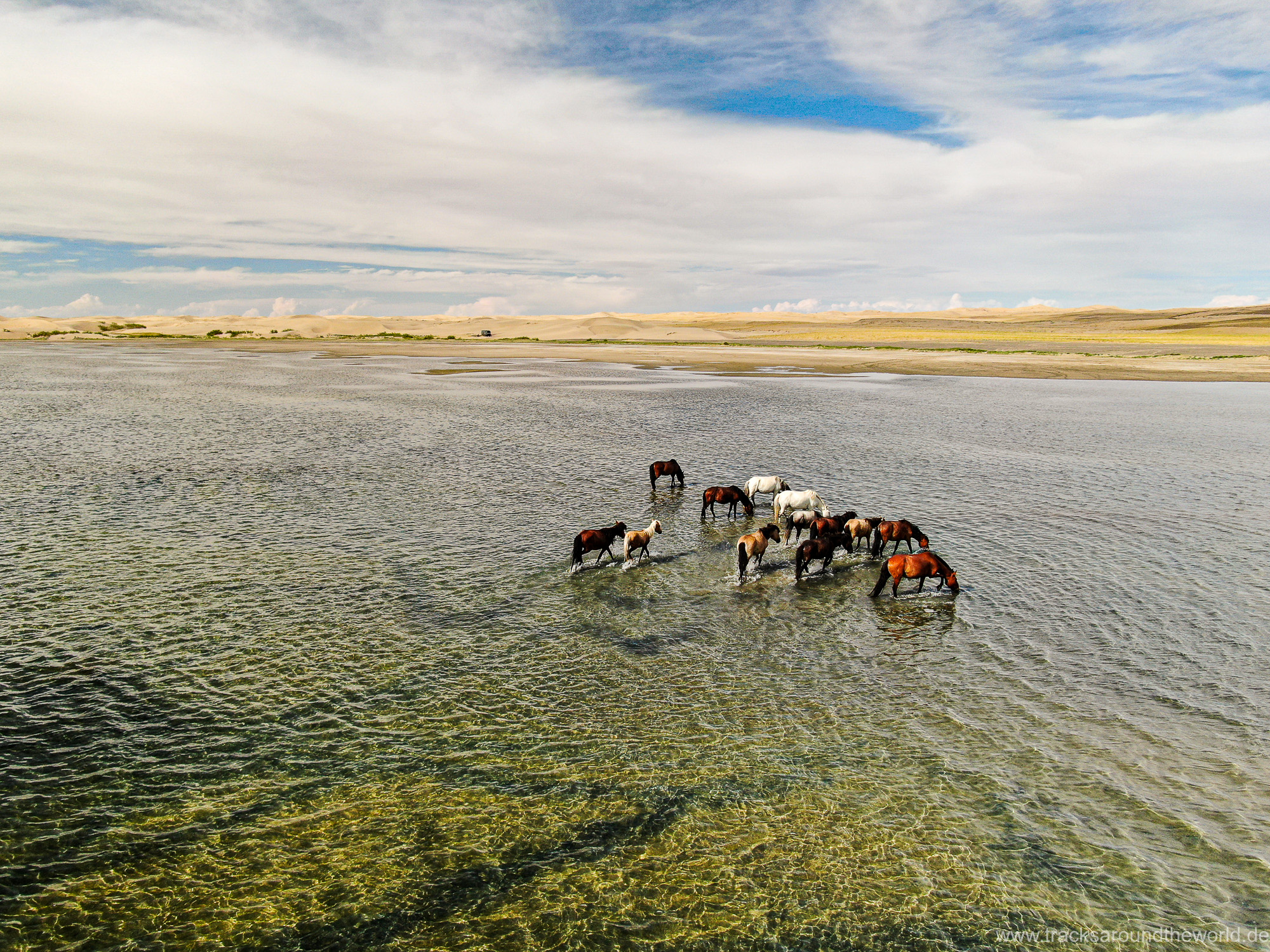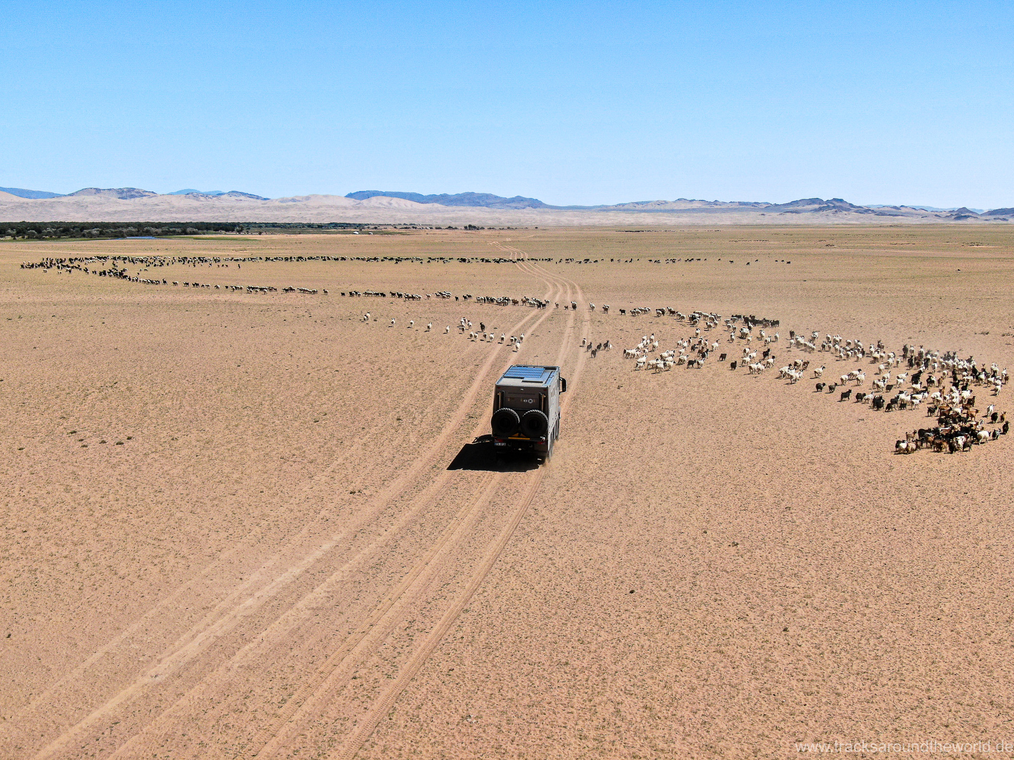 Im Nord-Westen der Mongolei gibt es viele Seen und ein weiteres Highlight ist der Dörgön Nuur mit seinen bis an das Wasser reichenden Sanddünen… da kommt auch Quad Shujoo wieder zum artgerechten Einsatz und der Gin Tonic Sundowner erinnert uns an die Wüsten der arabischen Halbinsel. Entlang des Mongol Els Sanddünen-Gebietes fahren wir weiter gen Osten und kommen in tolle Regionen, wo grün bewachsene Fluss-Ebenen fast nahtlos in goldene Sanddünen übergehen. Selten hatten wir Fahrtage, welche in Kombination der Faktoren Länge, Fahrtechnik und Navigation/beste Fahrspur auskundschaften so anspruchsvoll waren: Zahlreiche Furten (die tiefste welche bis an die Oberkante unserer nicht gerade kleinen Reifen ging, haben wir natürlich nicht festgehalten 😉), die permanente Orientierungs-Notwendigkeit (teilweise mit Hilfe unserer Drohne, Satelliten-Karten auf unseren Navis und vielen „Zu-Fuß Passagen“) für die beste Fahrstrecke sowie teilweise auch matschige Pisten lassen uns am Abend müde ins Bett fallen. Auch unseren ersten Platten auf dieser Tour haben wir zu verzeichnen. An einem Stein an der Flanke aufgerissen ist dieser leider nicht mehr reparabel.