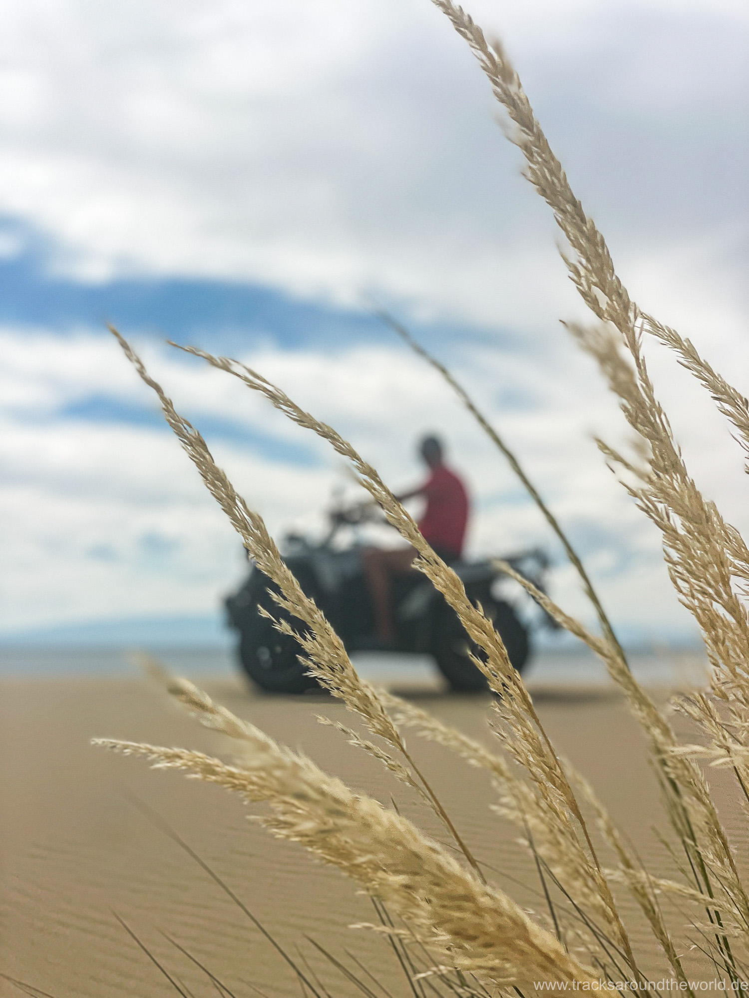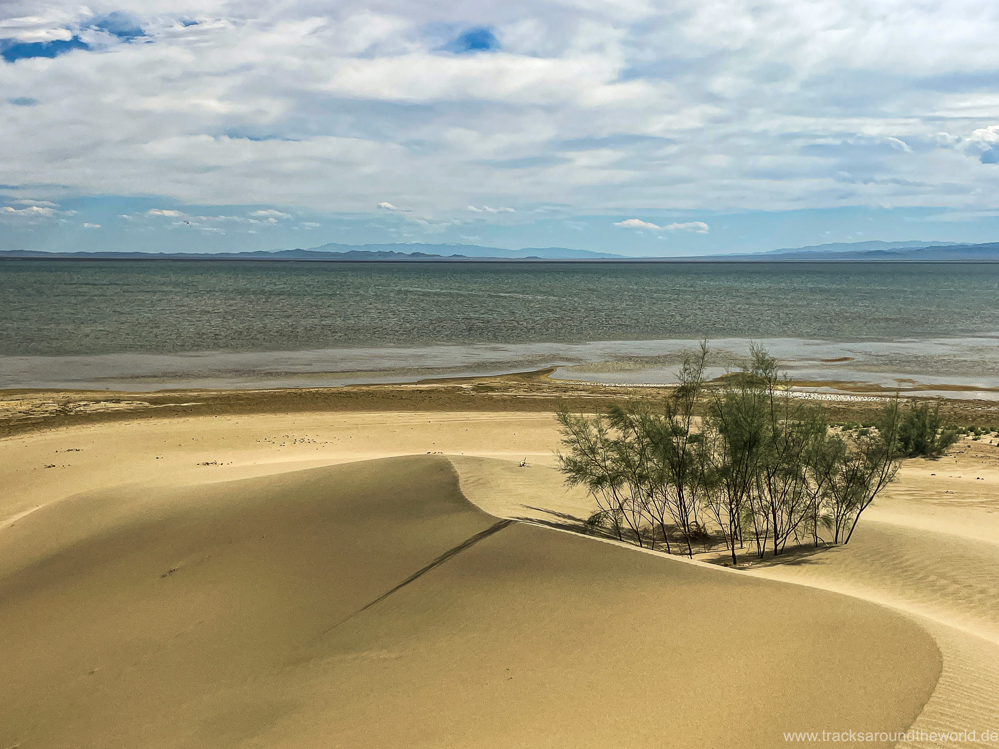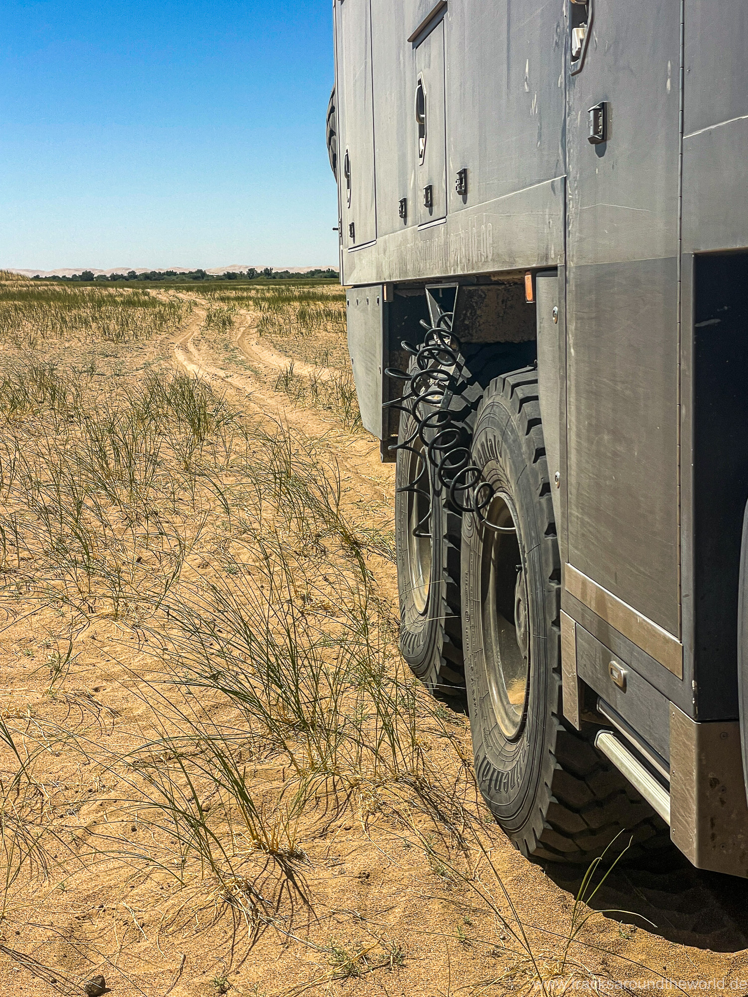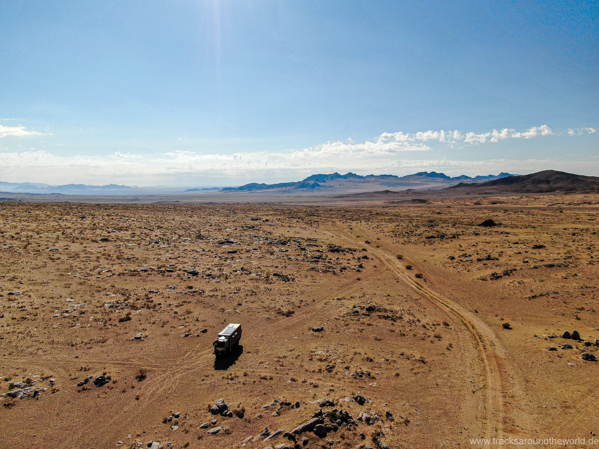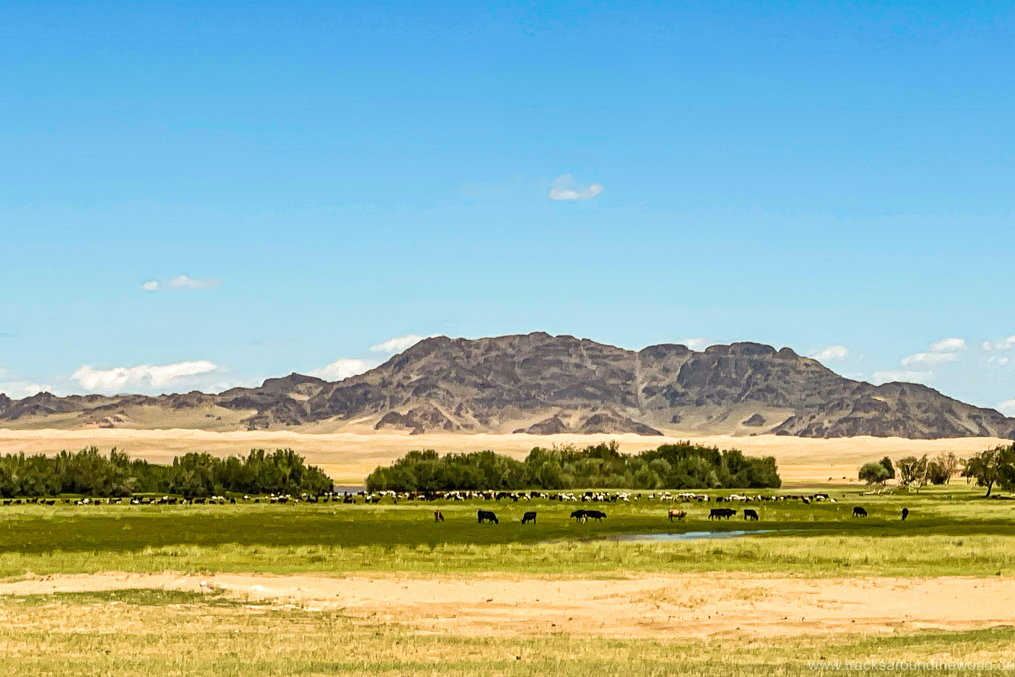 Im Nord-Westen der Mongolei gibt es viele Seen und ein weiteres Highlight ist der Dörgön Nuur mit seinen bis an das Wasser reichenden Sanddünen… da kommt auch Quad Shujoo wieder zum artgerechten Einsatz und der Gin Tonic Sundowner erinnert uns an die Wüsten der arabischen Halbinsel. Entlang des Mongol Els Sanddünen-Gebietes fahren wir weiter gen Osten und kommen in tolle Regionen, wo grün bewachsene Fluss-Ebenen fast nahtlos in goldene Sanddünen übergehen. Selten hatten wir Fahrtage, welche in Kombination der Faktoren Länge, Fahrtechnik und Navigation/beste Fahrspur auskundschaften so anspruchsvoll waren: Zahlreiche Furten (die tiefste welche bis an die Oberkante unserer nicht gerade kleinen Reifen ging, haben wir natürlich nicht festgehalten 😉), die permanente Orientierungs-Notwendigkeit (teilweise mit Hilfe unserer Drohne, Satelliten-Karten auf unseren Navis und vielen „Zu-Fuß Passagen“) für die beste Fahrstrecke sowie teilweise auch matschige Pisten lassen uns am Abend müde ins Bett fallen. Auch unseren ersten Platten auf dieser Tour haben wir zu verzeichnen. An einem Stein an der Flanke aufgerissen ist dieser leider nicht mehr reparabel.