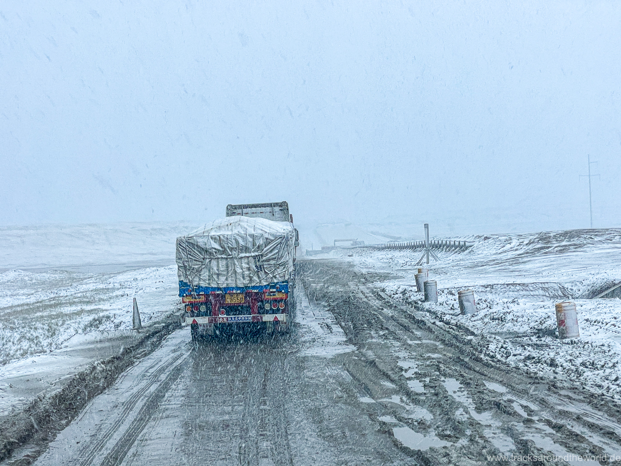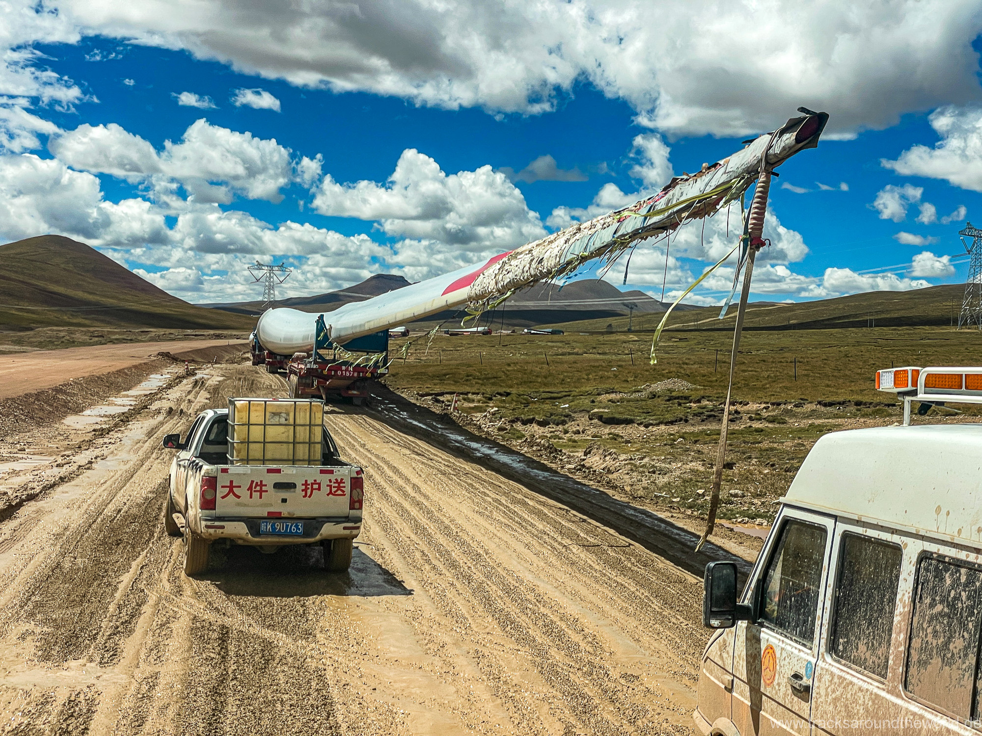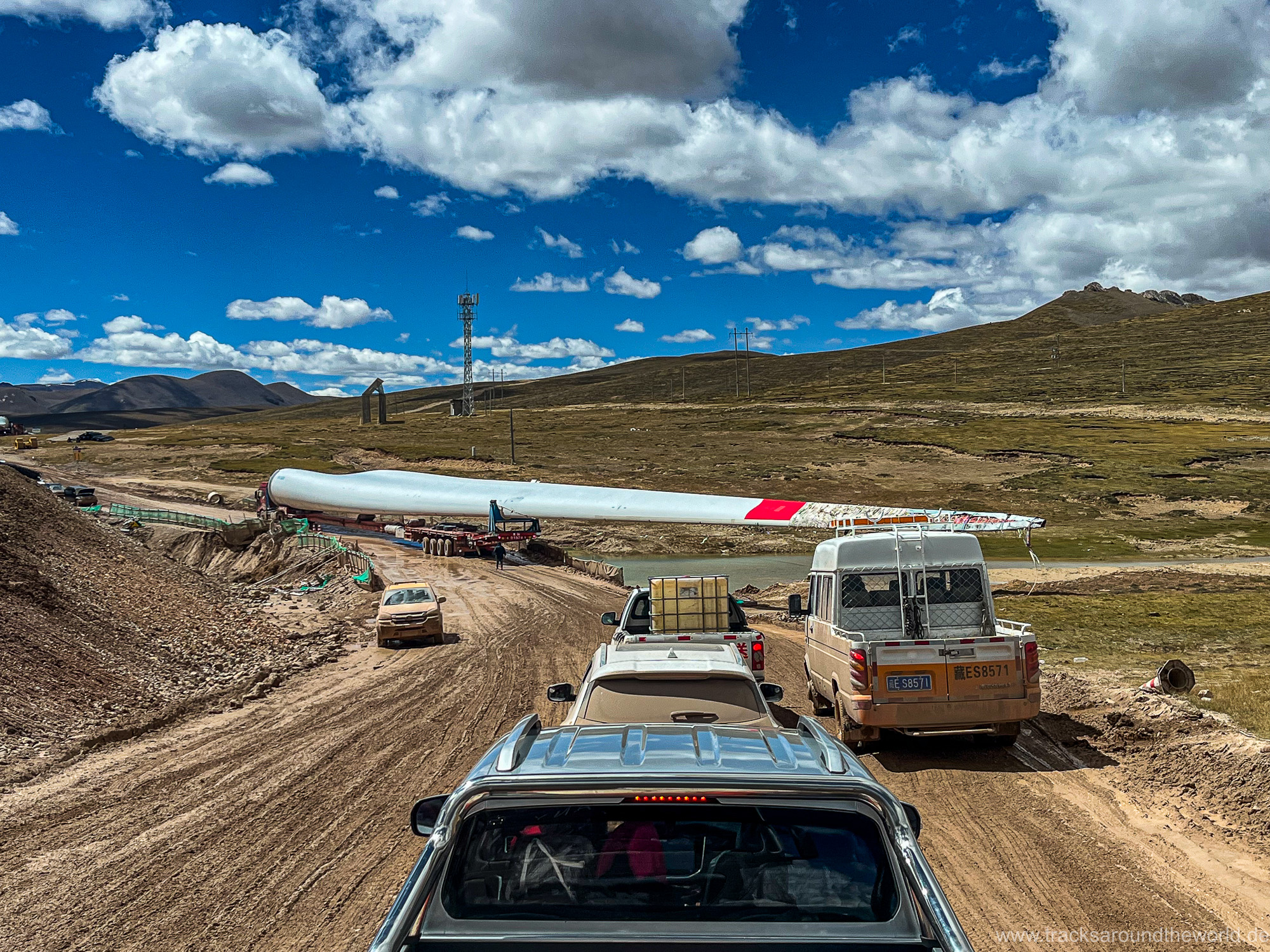 Neben dem Belastungsfaktor „Guide“ kommt die extrem strapaziöse An- und ggfs. Ab-Reise hinzu: auf der Hinfahrt müssen wir 750 km Erd-Piste mit teilweise extremen Regen bzw. Schnee und extrem intensivem LKW- und Schwertransport bezwingen: im Tief-Schlamm einen Konvoi von 12 jeweils ca. 80 Meter langen Wind-Rad Transport-Sattelschlepper zu überholen ist schon ein Erlebnis – das hatten wir in der Länge und Verkehrs-Intensität noch nicht einmal in Afrika und Südamerika! Zudem kommt, dass eine vernünftige Höhenakklimatisierung unmöglich ist: von Golmud schon auf knapp 3000 Hm geht es schnell auf das tibetische Hochplateau, wo wir uns die nächsten Tage auf mindestens 4500 Hm befinden. Zum Stress des Fahrens und des Guides kommt also noch die Tatsache dazu, dass man kaum schläft und alles sehr anstrengend ist. Als ob das alles nicht genug wäre, wird mit jedem Tag immer klarer, dass die Landgrenzen zeitnah nicht öffnen werden und der, gerade zu diesem Zeitpunkt stattfindende, Regierungs-Putsch in Nepal einer zielgerichteten Lösung auch nicht förderlich ist.