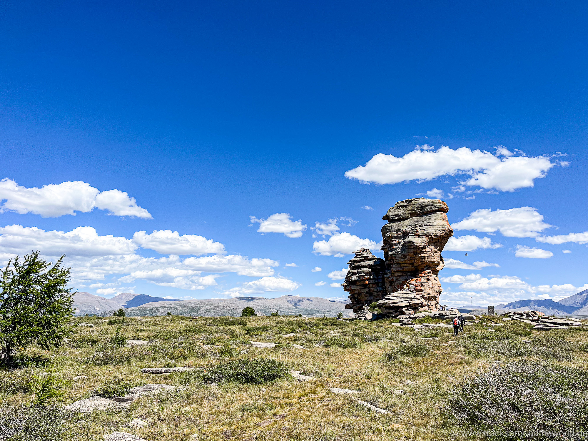 Near the provincial town of Uliastai, we plan to hike to the holy site of Dayan Zavkhan which lies above Lake Tsagaan Nuur. However, this hike presents us with certain challenges 😉. Firstly, the access road along the river valley is so rutted that we decide to stop after 30 km, find a nice spot under the trees on the picturesque riverbank, and decide to drive the remaining 15 km to the starting point of the hike the next day with our quad bike Shujoo. Secondly, the hike itself is listed in our guidebook with a total length of 20 km. Since we’re doing the first stretch by quad, I expect it to be 12-14 km. However, the information turns out to be completely wrong, and I end up walking almost 30 km that day. At the end I pick up Karin with the quad at a ranger station because she wouldn’t have been able to make it back herself – at least not in daylight. And yes, the hike itself was fantastic, and the climb up the sacred mountain Dayan Zavkhan with its bizarre rock formations, prayer wheels, and flags was a truly impressive experience. Sometimes you just have to push yourself to your limits, but we were both completely exhausted afterward.